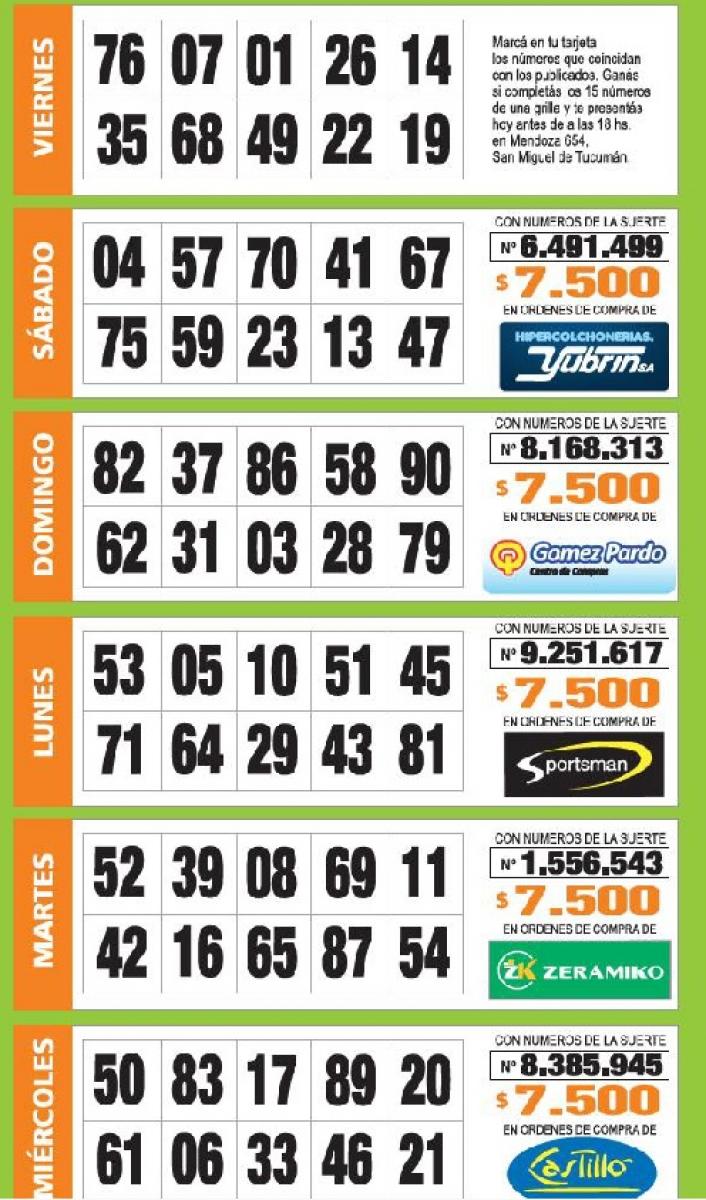 Como cada miércoles se publicó la grilla completa de los Números de Oro de LA GACETA para que los lectores puedan revisar sus tarjetas. Aquellos que completen los 15 números de una de las grillas de su cartón deberán presentarse en calle Mendoza 654 hasta las 18.
