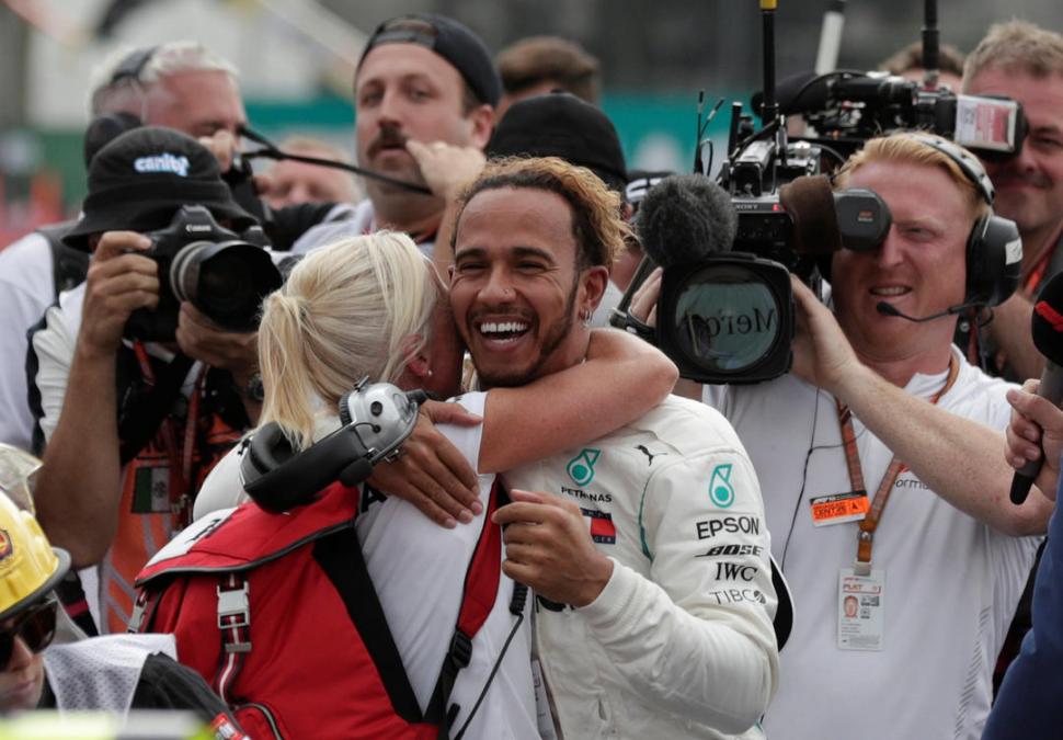 LA FELICIDAD SUPREMA. Lewis Hamilton, sonrisa amplia, recibió saludos y abrazos apenas se bajó de su Mercedes, ya convertido en campeón mundial 2018. reuters