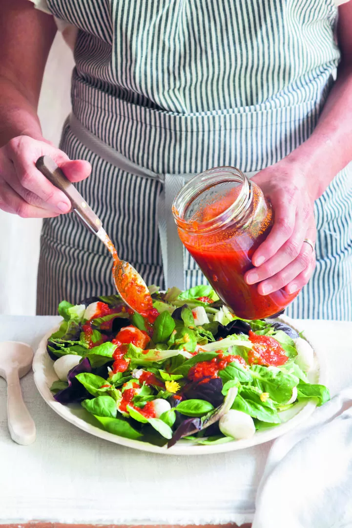 - Hoy las ensaladas son un plato en sí mismas, muy completas. Y mi libro está lleno de recetas originales, que tienen todo tipo de carnes, incluso langostinos. Fuera de eso, ya hay una conciencia a nivel mundial de que de todo lo que comemos en el día, la mitad deben ser frutas y verduras; un cuarto, proteínas y otro cuarto, hidratos. Por lo tanto, con un plato de ensalada tenés cubiertas esas necesidades. También incluí herramientas que sirven para un montón de recetas más, como una variedad de aderezos. Por ejemplo: un aceite de tomates secos que podés usar para pastas. Son herramientas fáciles, y que sirven para que digan después “wow, cuánto sabor”.