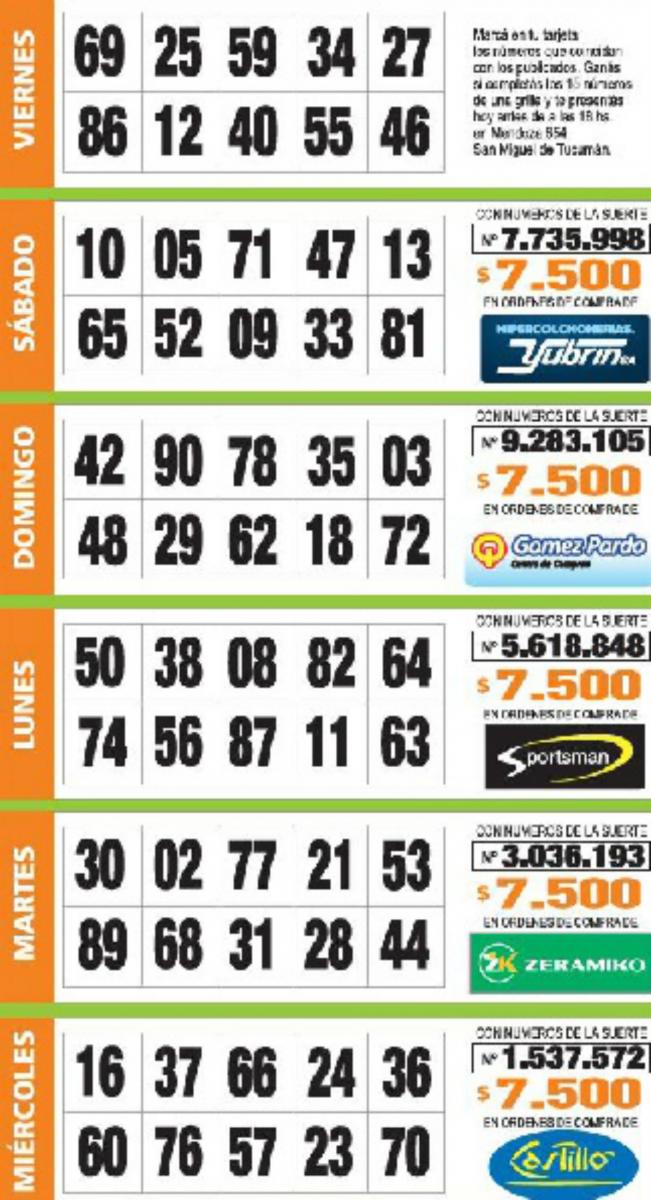 Como cada miércoles se publicó la grilla completa de los Números de Oro de LA GACETA para que los lectores puedan revisar sus tarjetas. Aquellos que completen los 15 números de una de las grillas de su cartón deberán presentarse en calle Mendoza 654 hasta las 18.