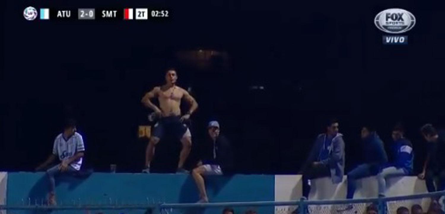 Un hincha aprovechó la ocasión para hacerle frente a la noche lluviosa y, sin remera, bailó feliz en la tribuna del estadio. Quedó registrado ante las cámaras y el comentario de los relatores.
