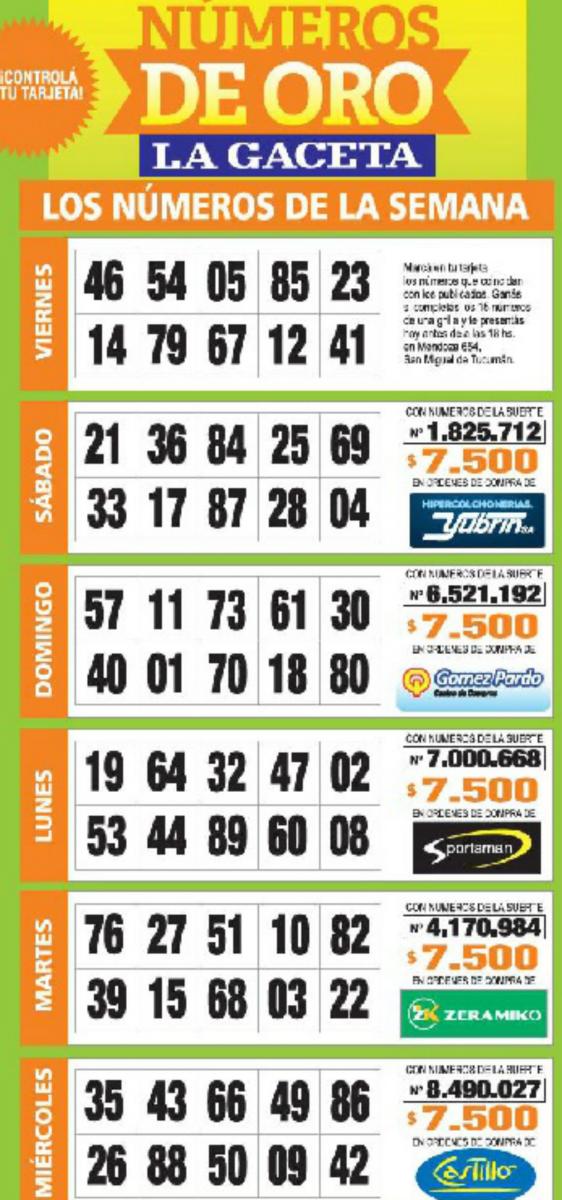 Como cada miércoles se publicó la grilla completa de los Números de Oro de LA GACETA para que los lectores puedan revisar sus tarjetas. Aquellos que completen los 15 números de una de las grillas de su cartón deberán presentarse en calle Mendoza 654 hasta las 18.