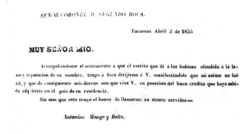 La hoja decía: “Señor Coronel D. Segundo Roca. Tucumán, Abril 3 de 1855. Muy señor mío: Acompañándome el sentimiento a que el escrito que di a luz hubiese ofendido a la fama y reputación de su nombre, tengo a bien dirigirme a V. manifestándole que mi ánimo no fue tal, y que de consiguiente mis deseos son que viva V. en posesión del buen crédito que haya sabido adquirirse en el país de su residencia. Sin más que esto tengo el honor de llamarme su atento servidor. Antonino Monge y Bello”.