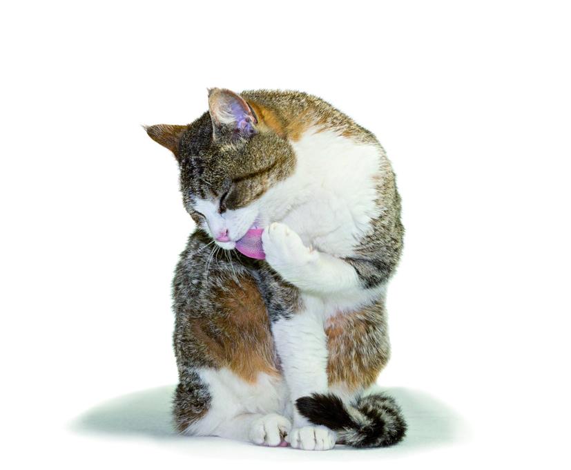 Los gatos domésticos se pasan entre 15 y 16 horas al día durmiendo, y el 24% del tiempo que pasan despiertos están lamiéndose el pelaje, por ello, es uno de los animales considerados como más limpios. Esta rutina de higiene evita las pulgas y el exceso de pelo muerto acumulado, y también hace que se regule la temperatura mediante la saliva que, gracias a los filamentos de la lengua (conocidos como cavo papilas) puede superar la barrera del pelo felino.