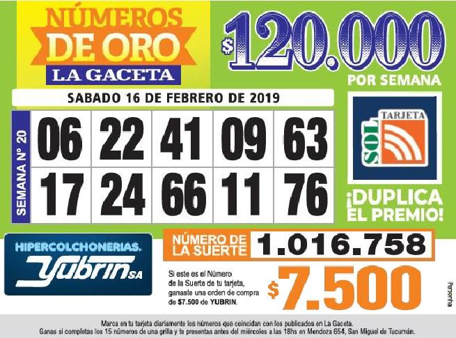 Los Números de Oro de LA GACETA del 20 de febrero de 2026