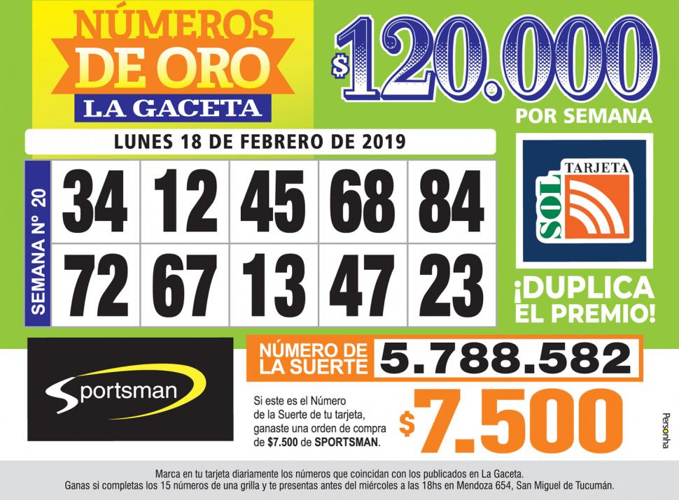 Los Números de Oro de LA GACETA del 20 de febrero de 2026