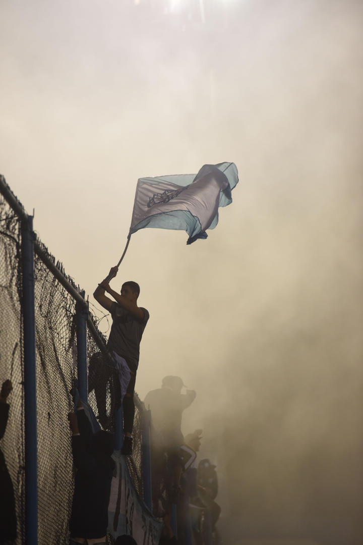 En medio del espeso humo blanco, y entre tantos otros simpatizantes, este hincha flamea una bandera para saludar el ingreso del “Decano” al campo de juego.
