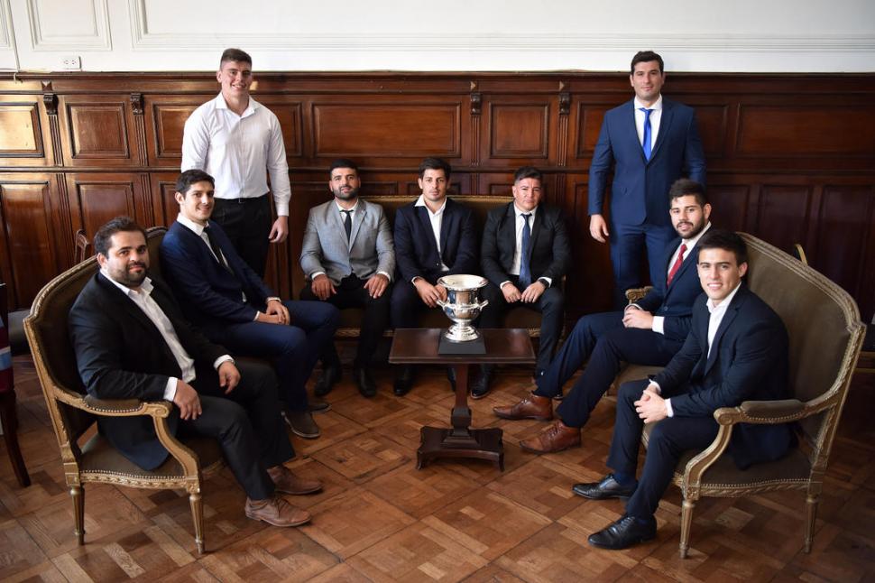 MESA CHICA. En Jockey Club, rodean a la Copa “Club LA GACETA”: Gabriel Fanjul (Lince), Rodrigo Ferro (Jockey), Mariano Perondi (Natación), Germán Rodríguez (Cardenales); Nicolás Sbrocco (“Uni”), Jesús Albornoz (Huirapuca); Santiago Pérez (Lawn Tennis), Lucio Urueña (Los Tarcos) y Santiago Paz Posse (T.Rugby). la gaceta / foto de nés Quinteros Orio