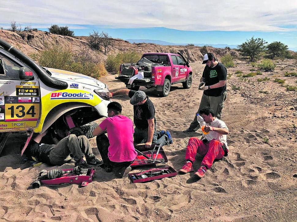 El binomio y su equipo (fotos de la derecha y abajo) lograron solucionar, aunque con penalización, la rotura de un amortiguador para terminar la etapa. No corrió la misma suerte Ricardo Neme (foto de arriba). Los esfuerzos por reparar una parrilla de suspensión no tuvieron éxito; se reengancha hoy.