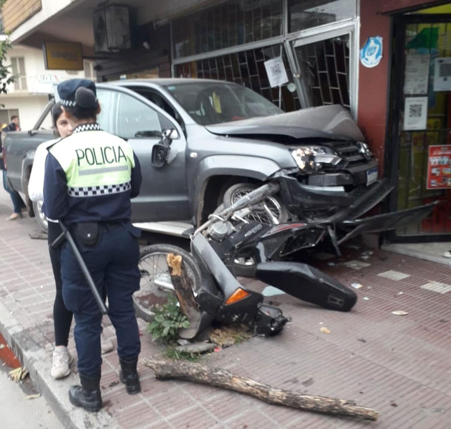 Una camioneta fuera de control subió a la vereda, derribó un árbol, embistió a una moto que estaba estacionada y terminó incrustándose en un comercio.