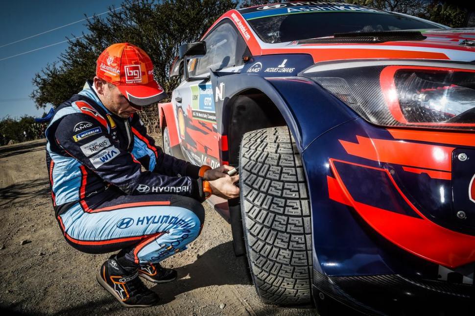 ATENCIÓN. Uno de los Hyundai del Mundial de rally recibe cuidado en las ruedas durante la carrera de México. press Kit-Michelin WRC 2019
