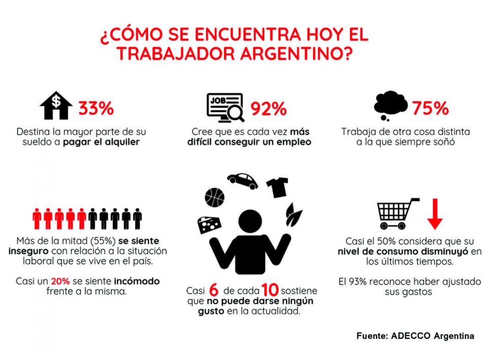 Al menos la mitad de la fuerza laboral reconocer que ha disminuido su consumo por efecto de la crisis económica que vive la Argentina. Otro 32% sostiene que lo ha incrementado y el 17 restante contestó que sigue igual que hace un año. Así lo reportó una encuesta efectuada por Adecco Argentina, filial de la empresa líder en el mundo en consultoría integral en Recursos Humanos. El diagnóstico sostiene, además, que seis de cada 10 trabajadores que participaron del sondeo consideraron que no puede darse gustos en la actualidad, mientras que un 23% sale a comer, un 17% ahorra, un 13,75% se compra ropa, casi un 13% sale de vacaciones y algo más del 11% concurre al cine, como una manera de esparcirse.