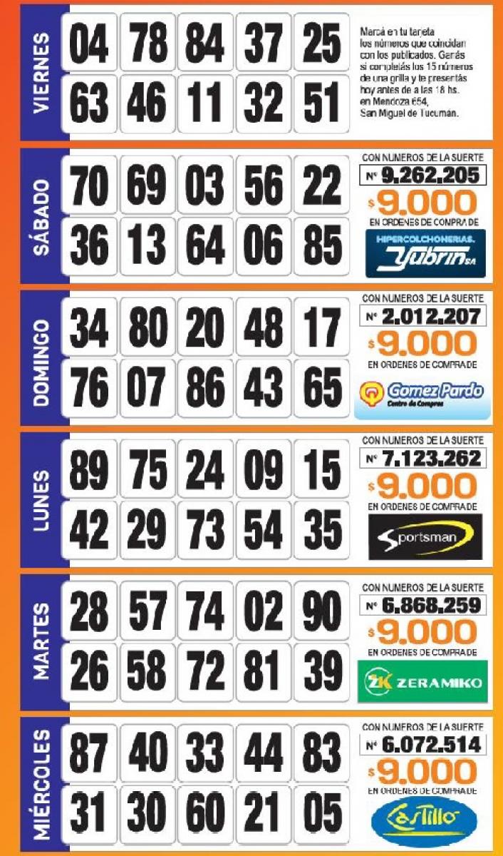 Como cada miércoles, se publicó la grilla completa de los Números de Oro de LA GACETA para que los lectores puedan revisar sus tarjetas. Aquellos que completen los 15 números de una de las grillas de su cartón deberán presentarse en calle Mendoza 654 hasta las 18. En caso de que el ganador sea usuario Tarjeta Sol, duplica el premio.