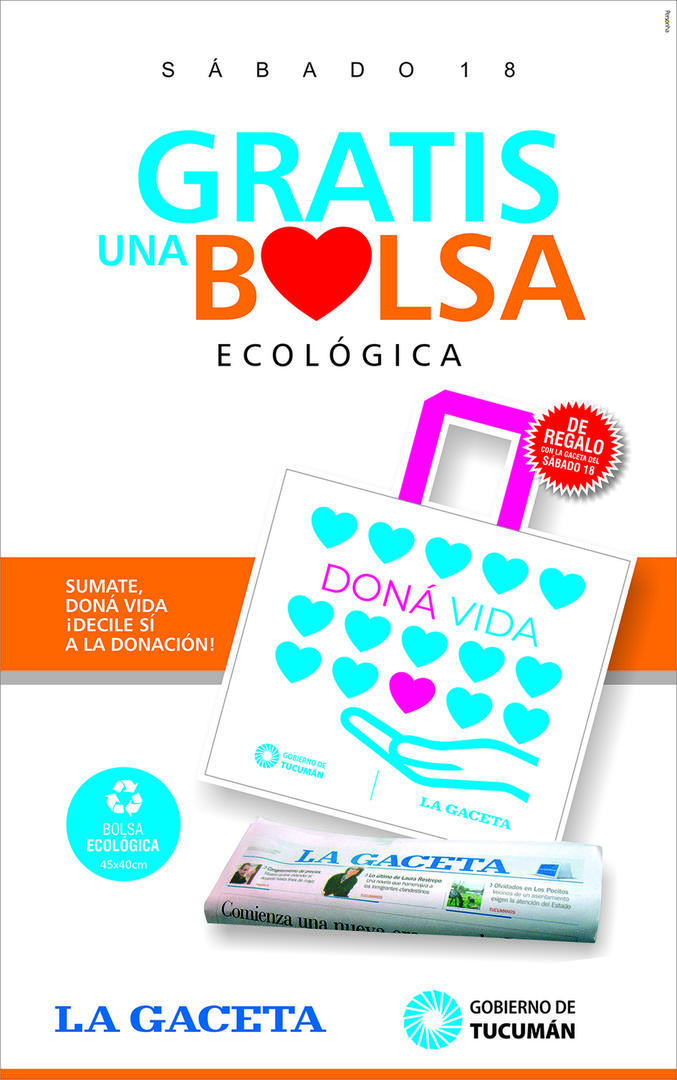 El próximo sábado se entregará una bolsa ecológica para concientizar acerca de la donación de órganos. Es una acción conjunta entre LA GACETA y el Gobierno de Tucumán. Se la entrega este mes, ya que el 30 de mayo es el Día Mundial de la Donación de Órganos. “Doná vida”, es el slogan usado, para incentivar esta acción solidaria entre los tucumanos.