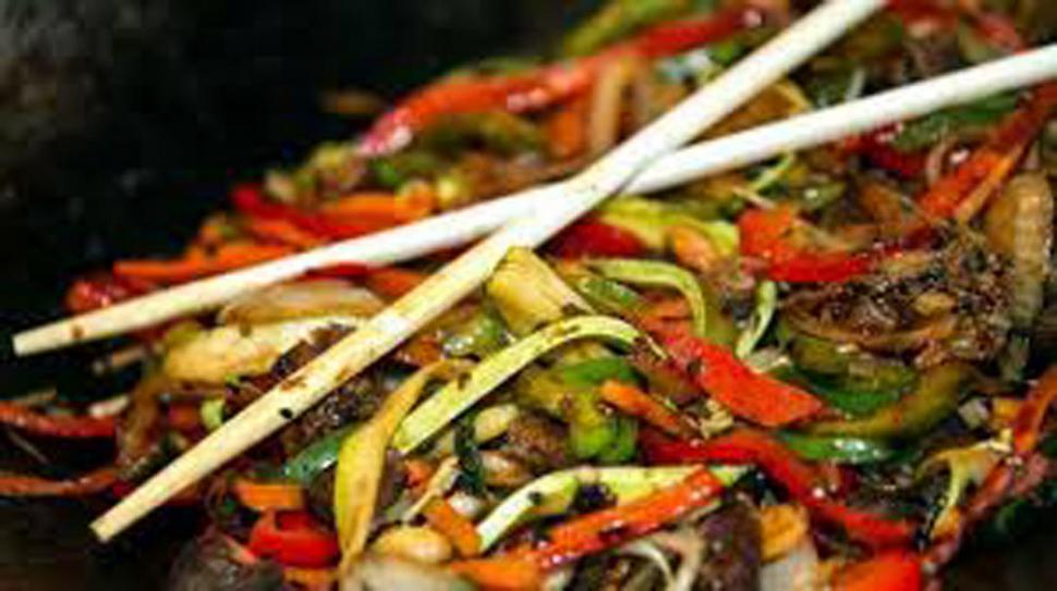 Preparación: salteá la carne salpimentada. En una cacerola diluí el caldo de pollo en dos tazas de agua hirviendo, agregá la salsa de soja, la salsa de tomates y la maicena diluida en el vino. Cuando hierva, añadí las verduras y rehogá por 5 minutos a fuego fuerte. Incorporá la carne, cociná 3 minutos más y serví con arroz blancoen platos soperos.