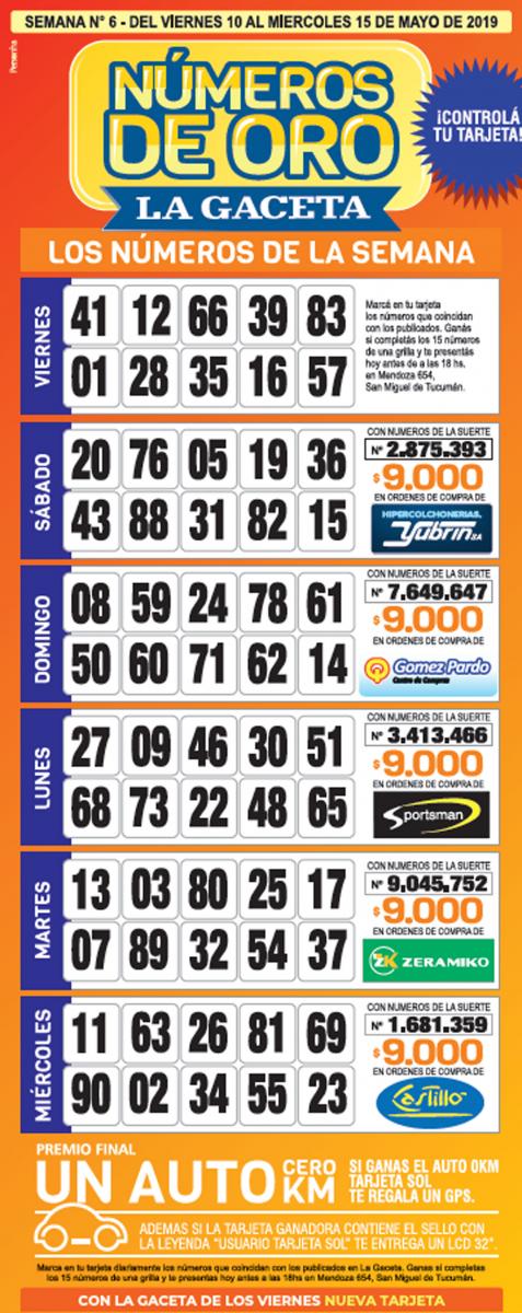 Como cada miércoles, se publicó la grilla completa de los Números de Oro de LA GACETA para que los lectores puedan revisar sus tarjetas. Aquellos que completen los 15 números de una de las grillas de su cartón deberán presentarse en calle Mendoza 654 hasta las 18. En caso de que el ganador sea usuario Tarjeta Sol, duplica el premio.