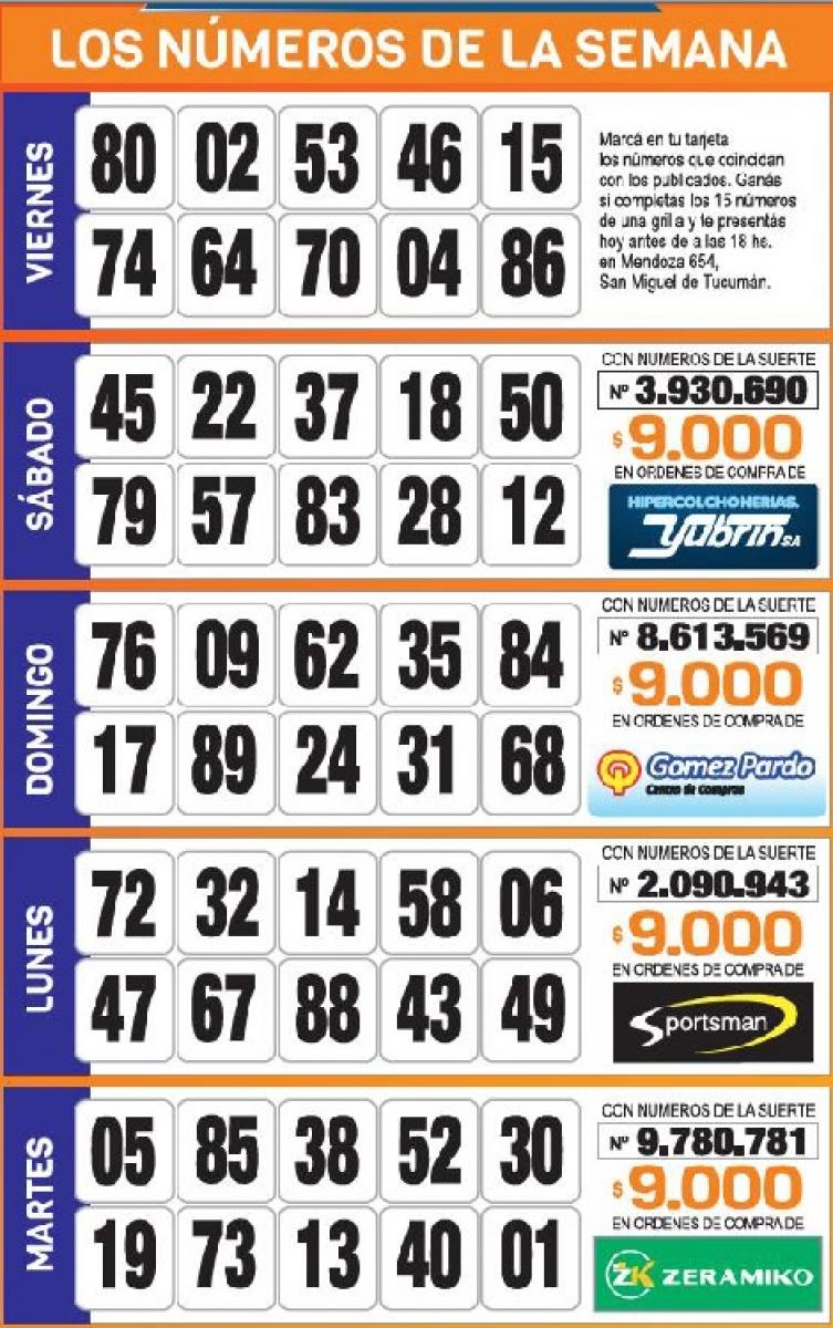 Como cada miércoles, se publicó la grilla completa de los Números de Oro de LA GACETA para que los lectores puedan revisar sus tarjetas. Aquellos que completen los 15 números de una de las grillas de su cartón deberán presentarse en calle Mendoza 654 hasta las 18. En caso de que el ganador sea usuario Tarjeta Sol, duplica el premio.