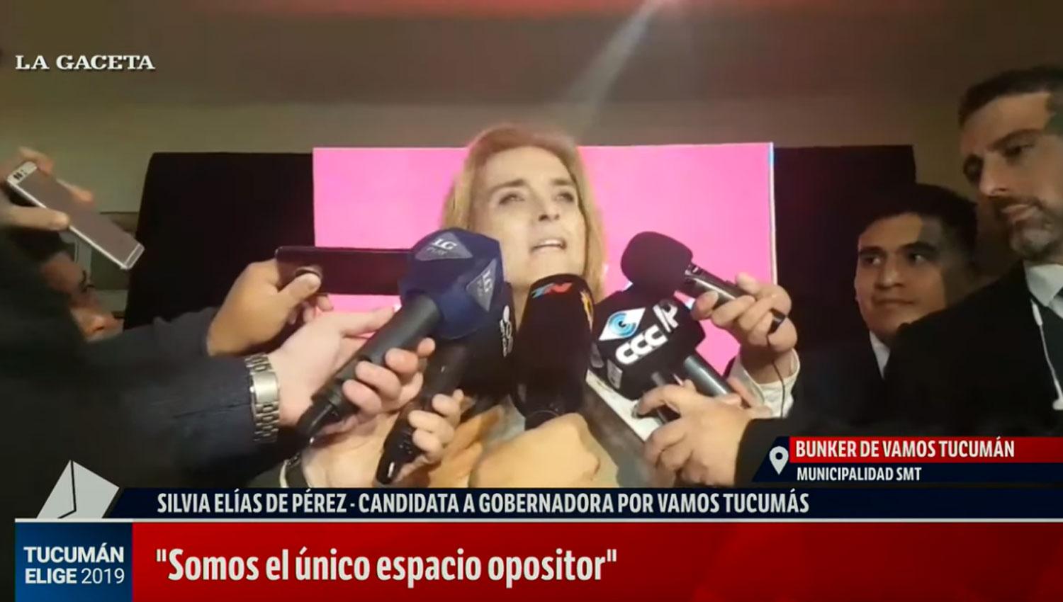 Silvia Elías de Pérez, hoy segunda en la elección entre los candidatos a la gobernación de Tucumán, se presentó en el búnker de Vamos por Tucumán. Allí felicitó a los intendentes que retuvieron sus respectivos municipios y también le envió un mensaje a quienes confiaron en ella en la lucha por la gobernación.