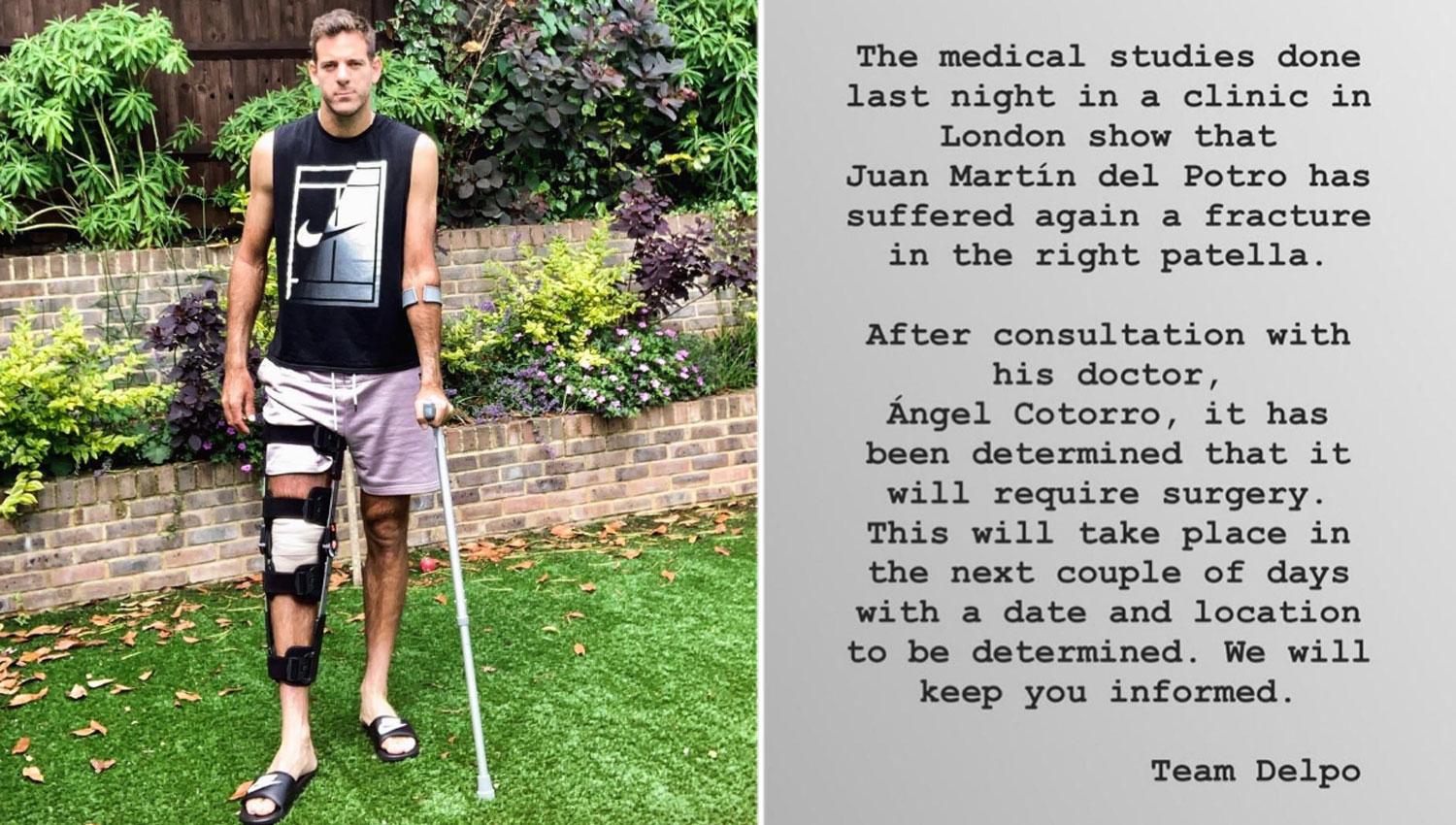 El tandilense Juan Martín del Potro recibió hoy otra pésima noticia, que lo obligará a pasar por el quirófano y a alejarse de las canchas por el resto de la temporada.