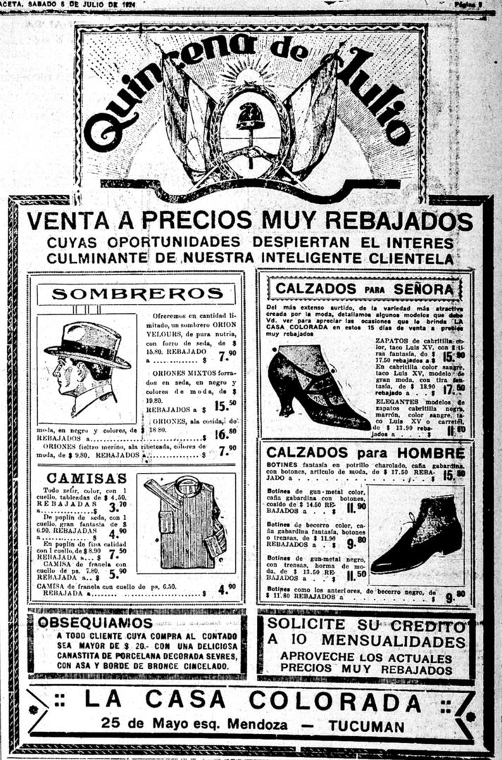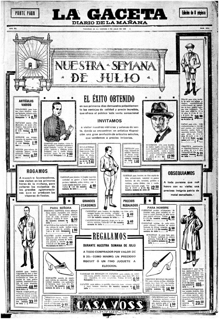 Junto con las fiestas de fin de año y la Navidad, las fiestas patrias, tanto de mayo como de julio, eran un momento del año en que el comercio realizaba campañas publicitarias ofreciendo sus productos a los tucumanos. En todas las publicidades se utilizaba la “fiesta julia” como elemento propagandístico. Se empleaban frases como “Semana Patria”, “Quincena de Julio. Ventas a precios muy rebajados”, “Semana de Julio, grandes rebajas”, “Nuestra semana de julio. Casa Voss”, “Esto lo debe tener bien en cuenta: con motivo de la semana de julio estamos vendiendo a precio verdaderamente bajos”, “Julio, el mes de las grandes rebajas”, entre otras más. Cabe destacar que las publicidades de fines de la década de 1910 y de 1920 ocupaban la tapa de nuestro diario en su totalidad. “Kalisay” era un aperitivo quinado que deleitaba “los paladares de grandes y chicos, recomendado por los médicos por brindar vigor al organismo”.