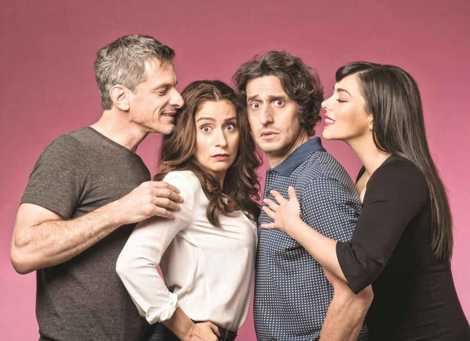 La historia trata de dos matrimonios que viven en el mismo edificio, y practican dos estilos de pareja diametralmente opuestos. Cuando se reúnen a cenar bajo un mismo techo, las paredes que sostienen cada departamento -y cada pareja- comenzarán a ceder y ya no se sabe quién vive dónde. “Los vecinos de arriba” se presenta como una comedia inteligente y fresca; llena de réplicas brillantes sobre la agonía del matrimonio tradicional, la sexualidad, el amor y las mil formas de abordar la convivencia. Todo comienza cuando la primera pareja se prepara para una visita de cortesía de la segunda, con discusiones sobre la oportunidad del encuentro: ella es un ama de casa bastante contemporizadora y él, profesor de piano en un instituto, es un neurótico difícil de contentar cuya mayor satisfacción es subir a la terraza para observar estrellas con un telescopio. Actúan Diego Peretti, Muriel Santa Ana, Rafael Ferro y Julieta Vallina.