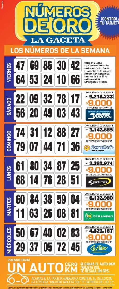 Como cada miércoles, se publicó la grilla completa de los Números de Oro de LA GACETA para que los lectores puedan revisar sus tarjetas. Aquellos que completen los 15 números de una de las grillas de su cartón deberán presentarse en calle Mendoza 654 hasta las 18. En caso de que el ganador sea usuario Tarjeta Sol, duplica el premio.
