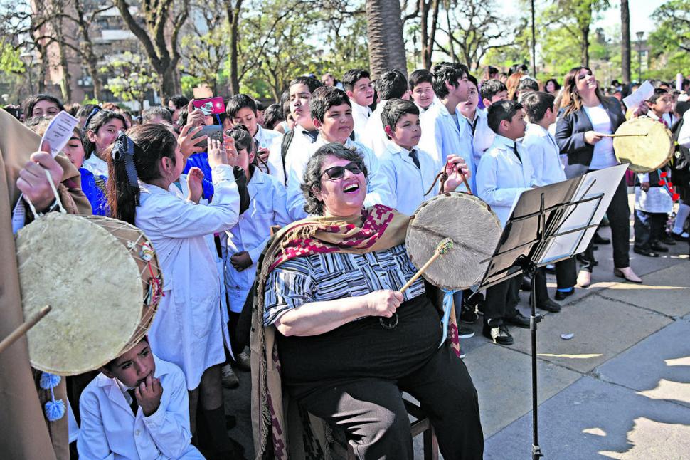 Desde su brioso caballo, San Martín observa la fiesta, en el basamento de su estatua. Ese es el escenario que ocupan los maestros-músicos, con carnavalitos y huaynos; con guitarra, acordeón, bombo, caja y sikus. Se suman unos 30 docentes de poncho tucumano, que impulsan el canto colectivo con sus cajas adornadas de tulmas de colores.