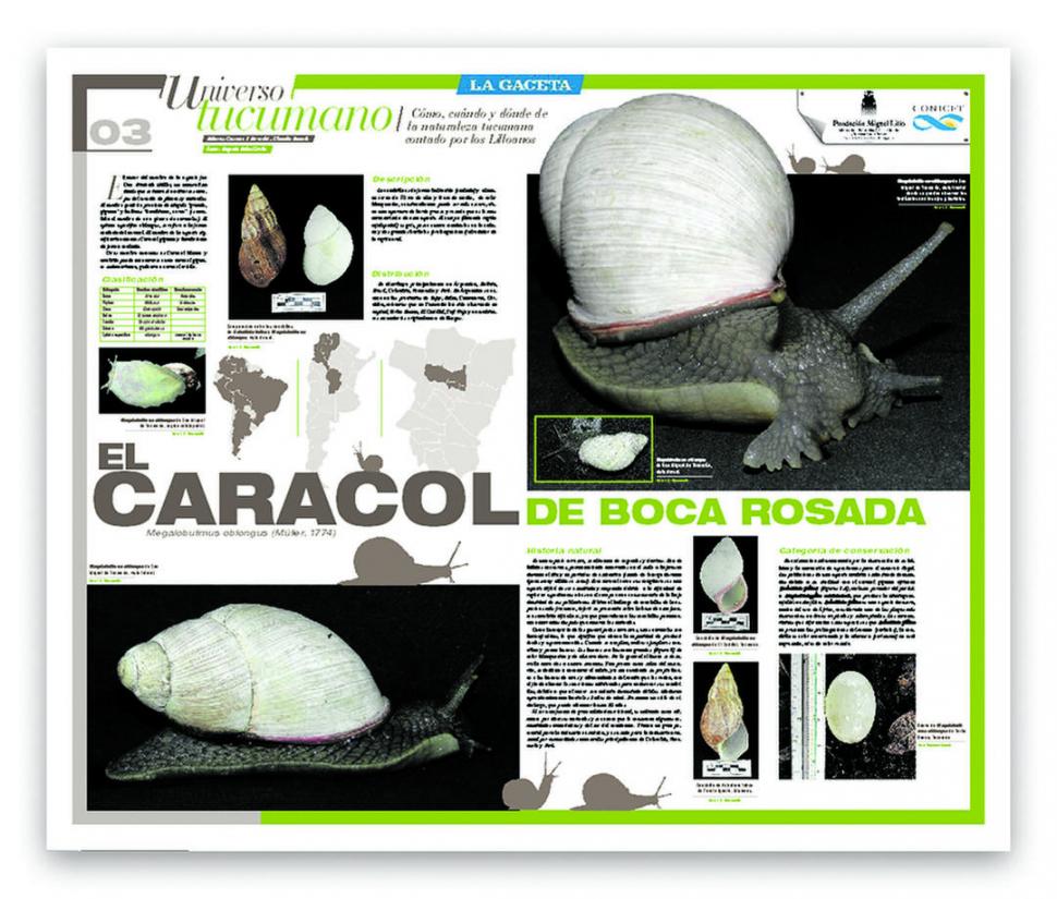 Con el diario de mañana recibirás una nueva lámina de la colección “Universo tucumano”. Se trata de un proyecto de divulgación de la fauna local realizada por LA GACETA en base al trabajo de investigación que llevan a cabo los investigadores de la Fundación Miguel Lillo. En esta oportunidad, junto con el ejemplar de LA GACETA, llegará a tus manos un desplegable sobre El Caracol de Boca Rosada.