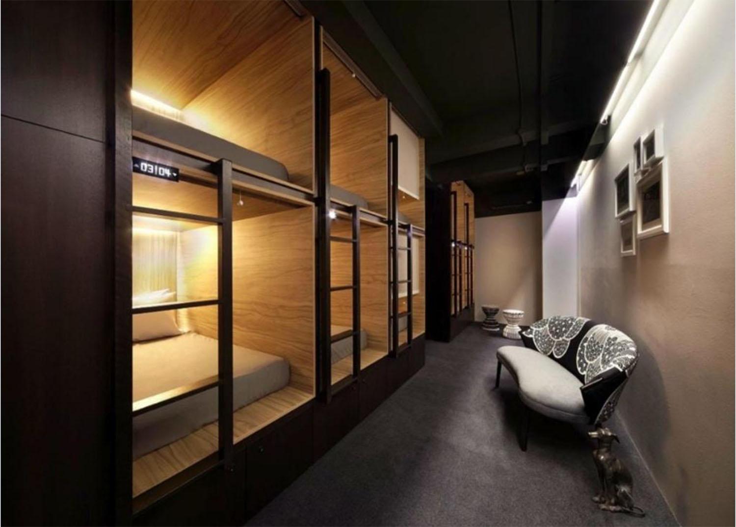 El hotel tiene ocho cápsulas de dos metros de largo por un metro de ancho; cada una equipada con un sommier individual, televisor LED fijado a la pared, escritorio flotante y locker.
