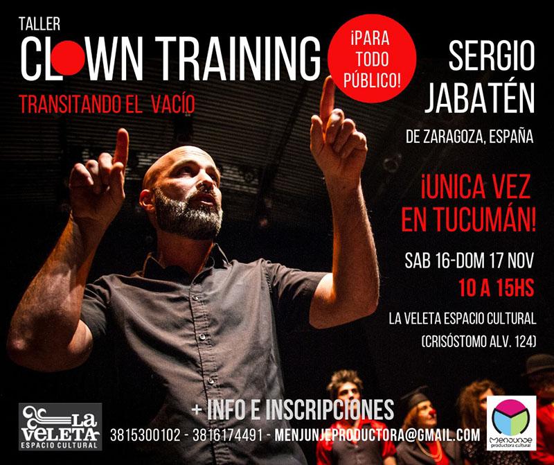 Hoy y mañana, de 10 a 15, en La Veleta Espacio Cultural (Crisóstomo Álvarez 124) Sergio Jabatén, de Zaragoza (España) dictará el taller Clown Training, transitando el vacío.