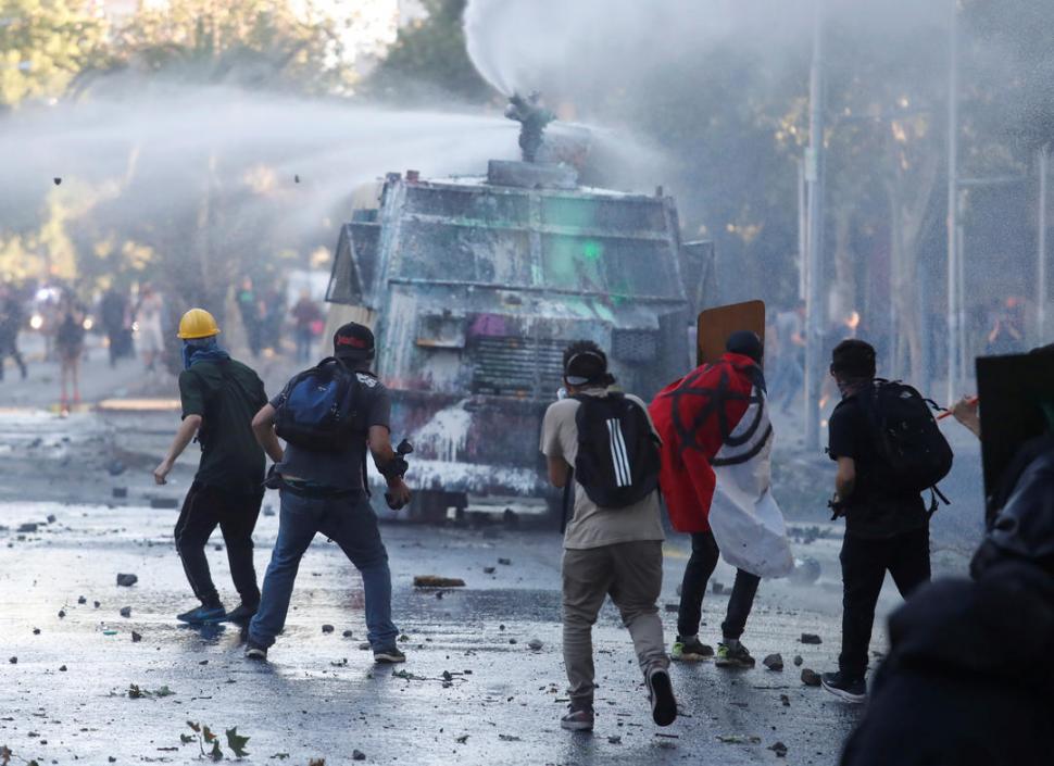 SIN TREGUA. Los manifestantes chilenos enfrentaron a las tanquetas hidrantes con piedras y gomeras. reuters
