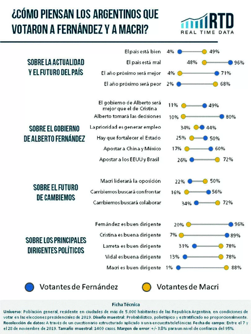 La consultora Real Time Data confeccionó una encuesta comparativa para reflejar el pensamiento de votantes macristas y fernandistas. El estudio fue realizado tomando como universo de muestra la población general, residente en ciudades de más de 5.000 habitantes del país, en condiciones de votar en las elecciones presidenciales de este año. El diseño muestral fue probabilístico polietápico y estratificado no proporcionalmente. La recolección de los datos se hizo a través de un cuestionario estructurado aplicado a una encuesta telefónica, realizado entre el 7 y el 28 de noviembre de este año, sobre 1.400 casos. El margen de error fue de más o menos 3% para un nivel de confianza del 95%.