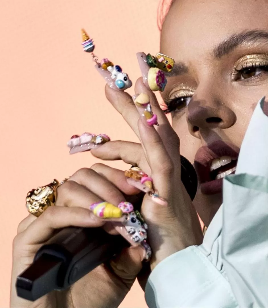 Colgantes que parecen llaveros, adhesivos 3D y diamantes Swarovski son algunos de los objetos decorativos de sus uñas, tan extremadamente largas y puntiagudas que parecen las garras de un animal.