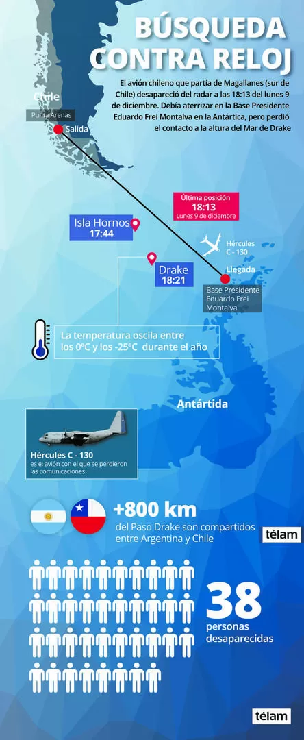 El avión chileno perdió contacto a 250 millas desde su despegue de Punta Arenas hacia la base antártica “Presidente Frei”, casi 500 kilómetros adentro del mar, lo que motivó un operativo de búsqueda del que también participan aviones de Argentina, Brasil y Uruguay. (Télam)