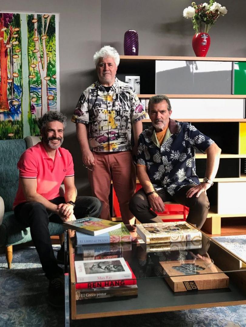 “DOLOR Y GLORIA”. Sbaraglia, Almodóvar y Banderas, en un alto del filme.