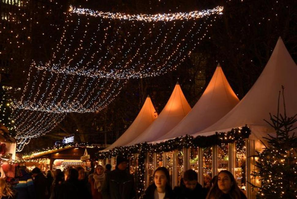 AUSTRIA. Un árbol, en el centro del paseo. La gente visita un colorido mercado navideño en Innsbruck.