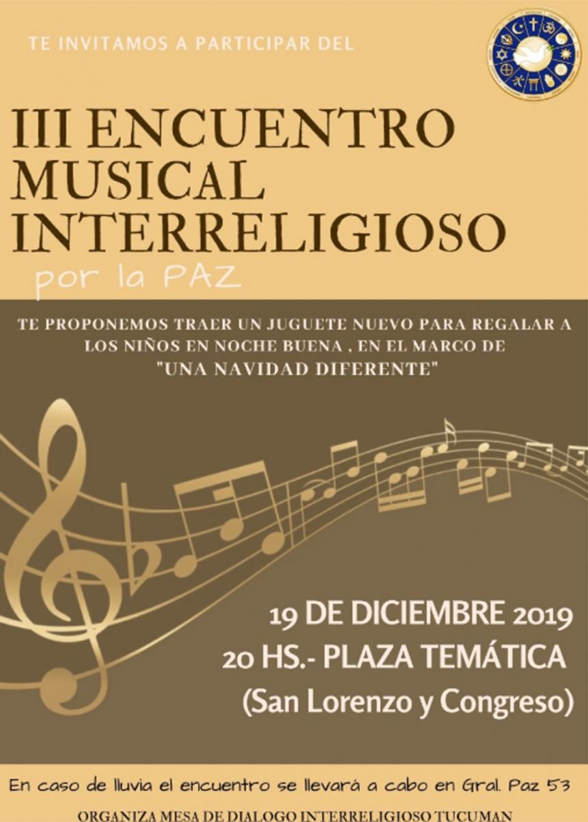 Organizado por la Mesa de Diálogo Interreligioso de Tucumán (DIR), esta noche, a partir de las 20, en la Plaza Temática de San Lorenzo y Congreso, se realizará el III Encuentro Musical Interreligioso por la Paz.