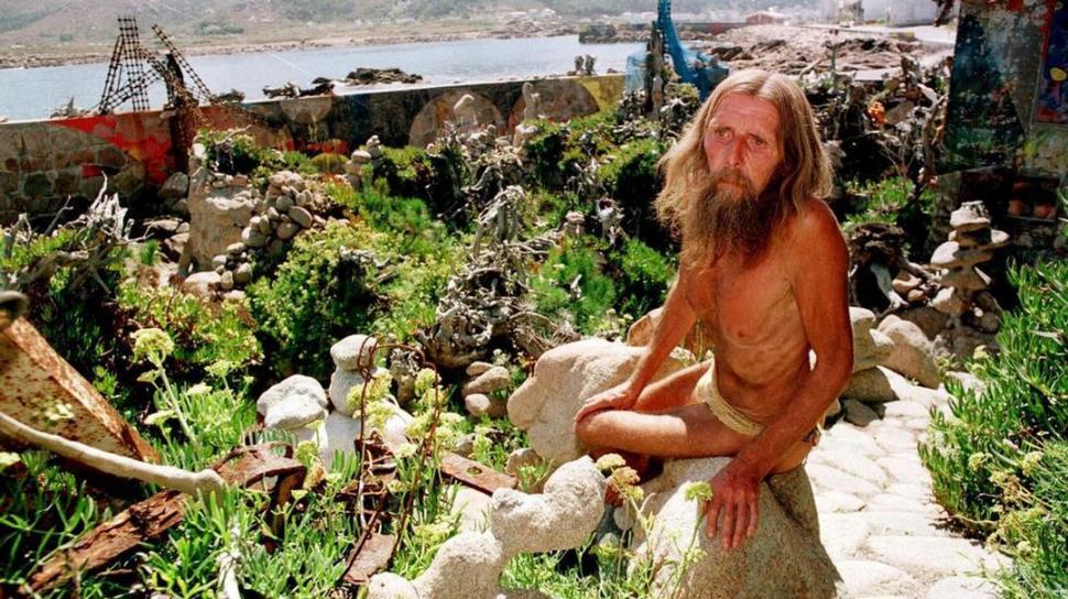 Era el último anacoreta. Al modo de Diógenes, el excéntrico filósofo griego que vivía en su barril, y con su manto, su zurrón y su báculo desafío al mundo con su libertad sin límites. Man de Camelle, el rebelde con causa, también se despojó de todo y abandonó el mundo para encontrarse con el planeta. Su barba y cabellera enmarañadas se confundían entre las fuerzas salvajes de las olas y la maleable roca marina. El loco gallego vestido con su eterno taparrabos recorría la costa de punta en punta en busca de los restos que el mar traía. Las vértebras de cetáceos, las astillas de barcos y los maderos de otros hemisferios, eran su tesoro. Riqueza acumulada por la sabia naturaleza. Como un naufragio de piedras y agua construyó su hogar y su obra de arte. Una maraña de colores, formas y restos fueron tomando forma en aquella costa descarnada. Un universo particular, en cuya cúpula titilaban millones de átomos de suave azul, era su hogar y su mundo. Él Atlántico del norte lo había atrapado para siempre. El mar se había convertido en su compañera, su nido y su paraíso perdido, tal vez por un amor despechado. Su cuerpo, como escudo y como única armadura, era un muro de hormigón contra el invasor impasible. El cemento fresco en el que se tumbó tres veces dejó su huella y su figura como un fósil viviente, la que quedara enclavada para siempre en la costa Da Morte. Solamente una horda bárbara, como una descomunal mancha liberando su vómito de fuel, puede arrebatar su mar, su costa y su obra. El lodazal de petróleo sobre el paraíso Atlántico es su destino cruel. El mal genio de un mar embravecido y el pantano negro nunca pueden desmembrar los colores del arco iris. Manfredo vivió en libertad, braceó contra corriente y alcanzo la felicidad absoluta. El mundo fue su casa y el árbol su choza. El rincón perdido en donde edificó sus sueños. Alfred Gnadinger, el solitario apóstol al servicio de un ideal, separo su cuerpo de este mundo. Su leyenda con la luz de la poesía y la eterna oración de la escritura permanecerá para siempre. El último ermitaño será siempre una roca inmóvil contra la cual se rompen en vano todas las olas. Tímido y solitario, envuelto de viento, sol y salitre. ¿Qué le han hecho al mar? Te han arrancado del corazón, con lanzas de miseria, la atlántica belleza, que lo inundaba todo.