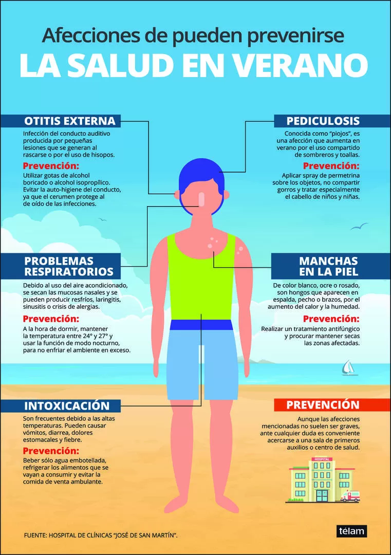 Otitis, hongos, piojos, picaduras, intoxicaciones y enfermedades respiratorias por el uso de aire acondicionado son algunas de las afecciones de salud más frecuentes durante el verano y, si bien la mayoría no son graves -a excepción de las neumonías por gérmenes-, pueden complicar las rutinas de playa o pileta, informa Télam.