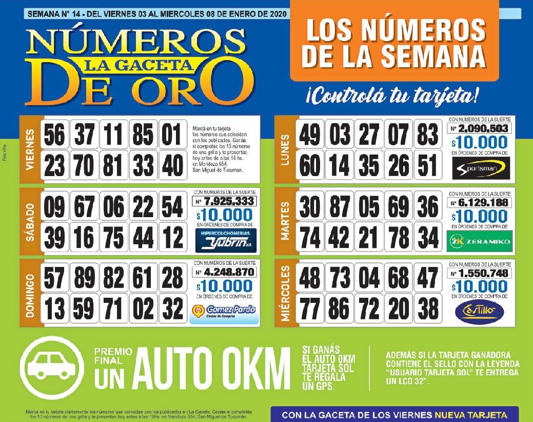 Como cada miércoles, se publicó la grilla completa de los Números de Oro de LA GACETA para que los lectores puedan revisar sus tarjetas. Aquellos que completen los 15 números de una de las grillas de su cartón deberán presentarse en calle Mendoza 654 hasta las 18. En caso de que el ganador sea usuario Tarjeta Sol, duplica el premio.