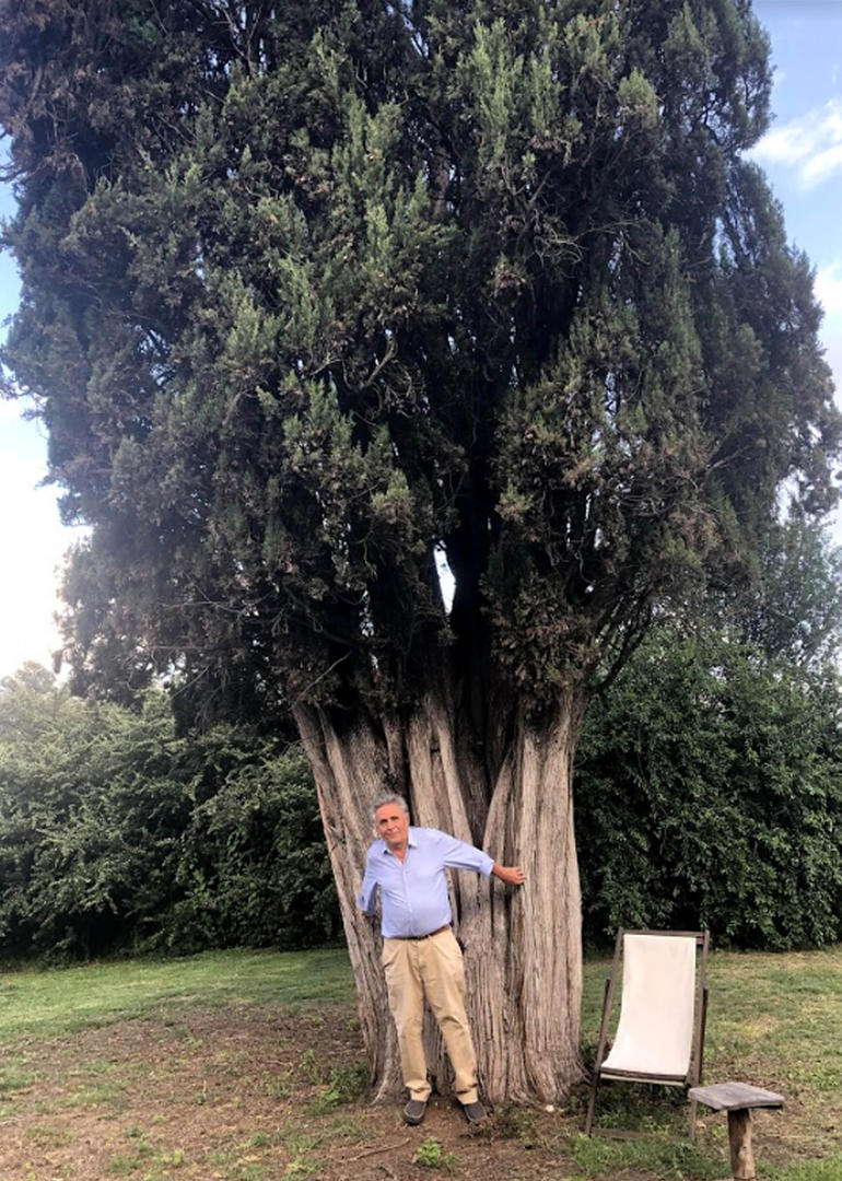 A LA SOMBRA DEL CIPRÉS. Solano Peña se abraza al árbol que domina el fondo de la estancia Las Tacanas.