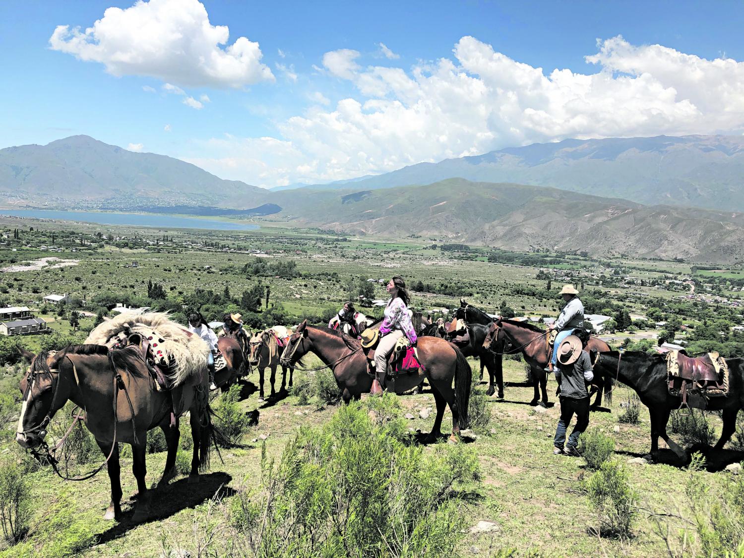 Una subida más abrupta avisa que el destino se acerca. Despacio, la tropilla trepa y dibuja un zigzag. Cada metro conquistado modifica la percepción del entorno. Así como la bajada no tiene fondo, tampoco tiene límite la subida: la montaña “educa” con sus direcciones contrapuestas. Llega un punto en el que Rasjido se detiene y manda a desmontar con la prudencia que aconseja el miedo atávico a las patadas de los caballos. Por las espaldas aguarda el mirador y su colección de imágenes magníficas. Todo el Valle cabe en esa “ventana”, y la foto deviene inevitable mientras el viento desacomoda los peinados y juguetea con los sombreros.