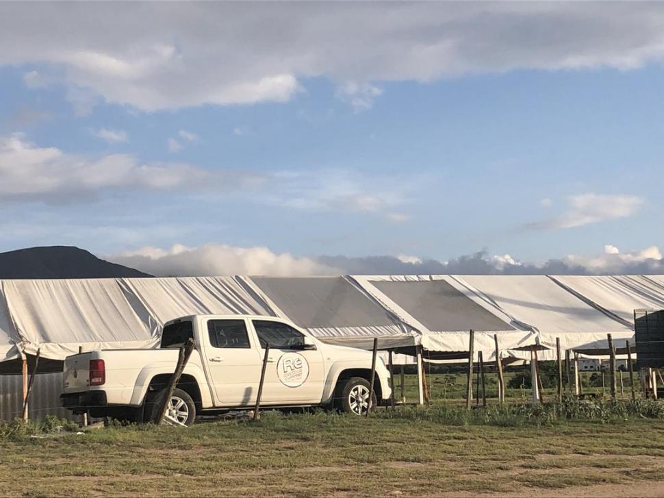 EL MONTAJE DEL BOLICHE. Una camioneta de Recórcholis y las carpas en el predio del km 61 de la ruta 307.