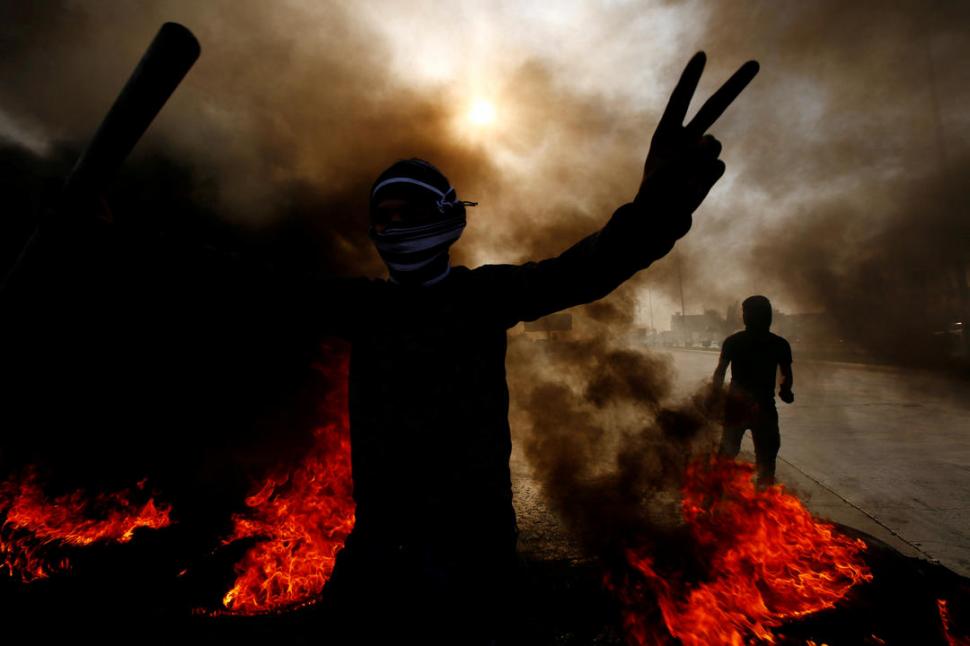 Un manifestante gesticula ante las cámaras. El fuego que arde a su alrededor consume cubiertas de vehículos que fueron colocadas en una ruta. La imagen fue captada durante una manifestación en contra del Gobierno en la ciudad de Najaf.