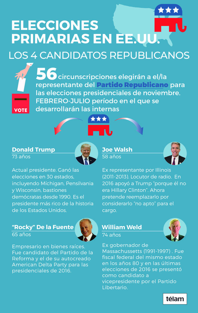 Pese a que el presidente de Estados Unidos, Donald Trump, se presenta como el ganador indiscutido de las futuras primarias del Partido Republicano, hay otros tres precandidatos dispuestos a enfrentarlo. Entre los oponentes sólo dos de ellos cuentan con posibilidades reales de lograr alguna victoria en las internas: el ex representante por Illinois Joe Walsh y el ex gobernador de Massachussetts William Weld. El tercer rival, el empresario Rocky de la Fuente, es considerado como un “candidato perenne”, que apenas cuenta con apoyos en los sondeos y participará sólo en 13 de las 27 contiendas.
