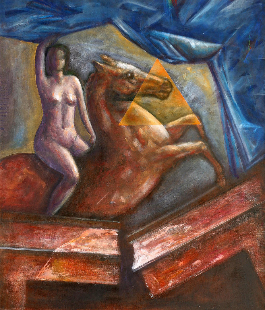- El “tema” puede ser un pretexto para plasmar un planteo, un enigma plástico, una pintura. A veces nos desvela ese juego y encuentro con los resortes que movilizan nuestra interioridad y son como claves del universo y que nos maravillan, sobre todo cuando tiene que ver con la naturaleza o con alguna verdad escondida de la condición humana. Podemos pintar todo tipo de tema, desde el más intenso o dramático al más apacible y tranquilizador. Así como se desliza el óleo sobre el lienzo, corre la vida y su dinámica creadora. Bocetos, estudios desinteresados, libres, son los talismanes que ordenan, dirigen orientan sobre futuras obras. La acción precede a la teoría. El presente acontece en medio de vivencias, sensaciones, sentimientos, armónicas o contradictorias, esto nos empuja a pintar. La esencia de esto puede trasladarse a obras, como me ocurrió con la obra “El rapto de Helena” (de la serie Carrusel). La improvisación, con conocimiento de ciertos recursos pictóricos, apropiados al tema, es lo que me hace asociar la pintura con el jazz, como por ejemplo en obras como la de “Los olvidados”, o un retrato de Borges, o “Intermezzo burlesco”. Además esa sensación de armonía y de pronto la introducción de un elemento sorpresivo, espontáneo. Muchas melodías de jazz acompañan con swing el momento de juego sagrado del pintar, como en la obra “Esquina Rosada”.