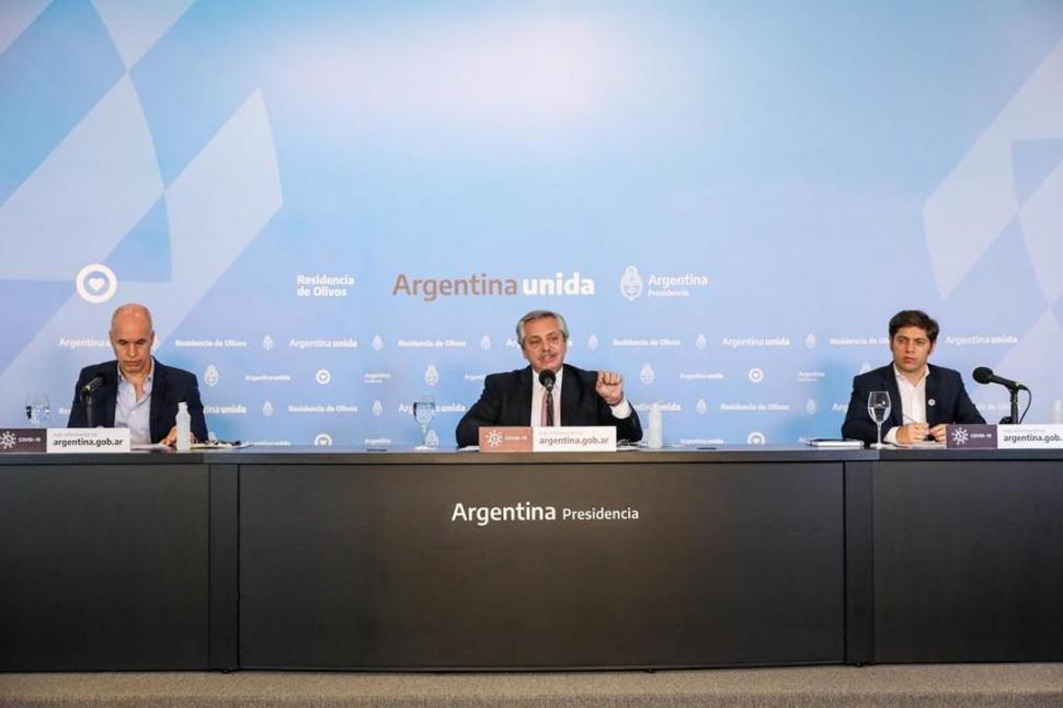 ANUNCIO. El área metropolitana de Buenos Aires seguirá en aislamiento. Precisamente, el jefe de Gobierno porteño y el gobernador bonaerense flanquean al Presidente. PRESIDENCIA