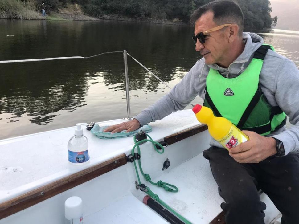 CUIDADO. Palacios limpia con desinfectante el exterior antes de salir a navegar.