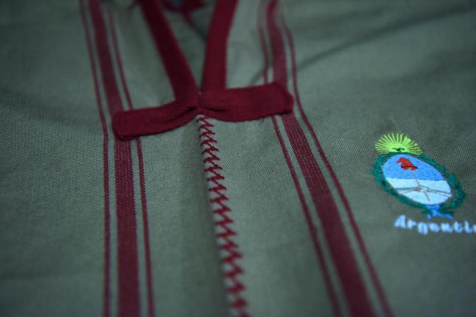 En cuanto a la gruesa franja bordó y las dos finas líneas en los costados y el cuello, su inspiración remite a los ponchos colorados de antiquísima factura en el Tucumán indiano, cuyo secreto cromático era el socondo: una planta que crece en los cerros.