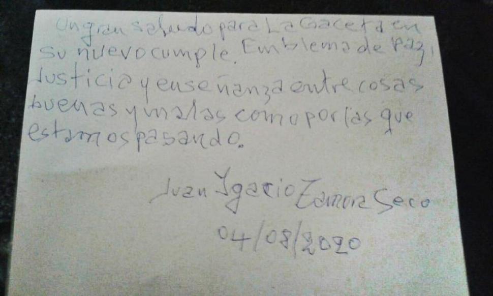 Con profundo respeto envío esta foto de un escrito de mi padre: Juan Ignacio Zamora Seco, ávido lector y seguidor de LA GACETA y así también participante de sus páginas con pequeños y esporádicos escritos, poemas o cartas al Director. Actualmente tiene 84 años y no pasa un día en que no lea LA GACETA. Muy agradecida, les deseo al igual que mi papá un saludo de aniversario ¡Felicidades!